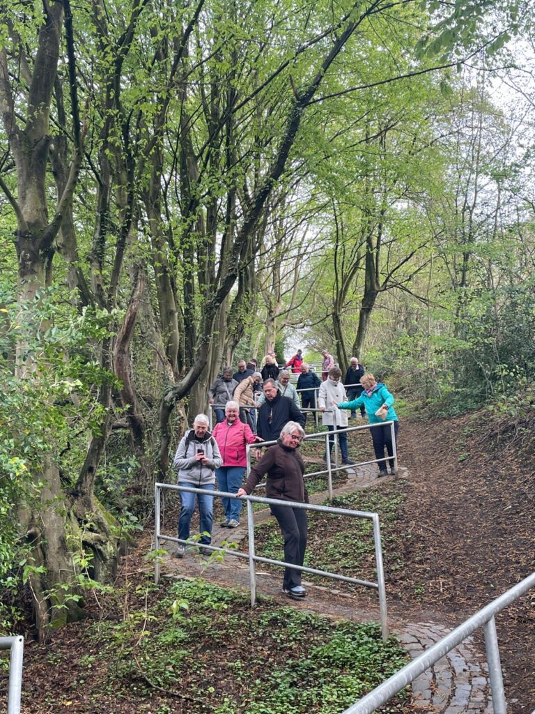 Im April führte Wanderführer Kalle eine Gruppe von 21 Mitgliedern auf einer 7.300 Meter langen Strecke von Mülheim Heimaterde nach Essen Holsterhausen. Nach 135 Minuten erreichten sie ihr Ziel. Die Gruppe traf sich zunächst am Essener Hauptbahnhof und fuhr gemeinsam mit der U18 nach Mülheim Heißen, wo weitere Teilnehmer hinzukamen. Von dort aus wanderte die Gruppe durch eine Bergbauwohnsiedlung zum Sunderplatz, weiter in den Wald bei Essen Margaretenhöhe und schließlich zum Restaurant „Am Mühlenbach 74“.